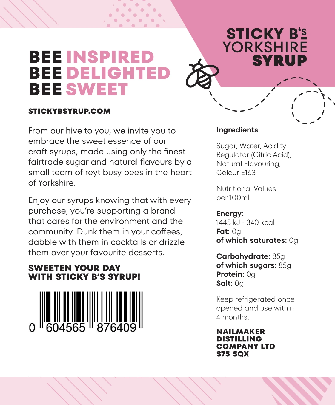 Sticky B’s classic syrups are lovingly crafted in Yorkshire in small batches. Made with Natural Flavourings, Fairtrade Sugar and Crystal Clear Spring Water, our syrups really are the bee’s knees.